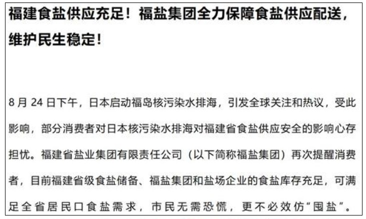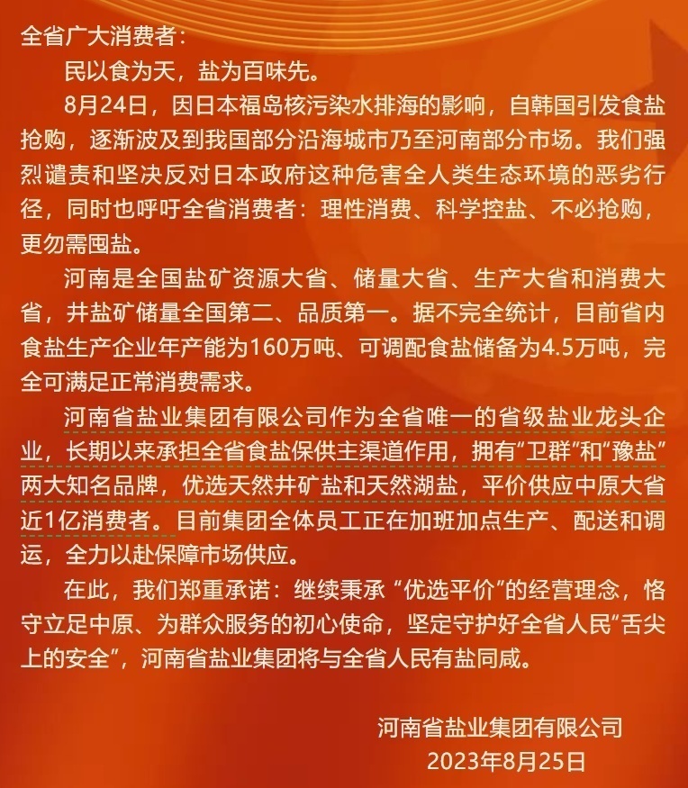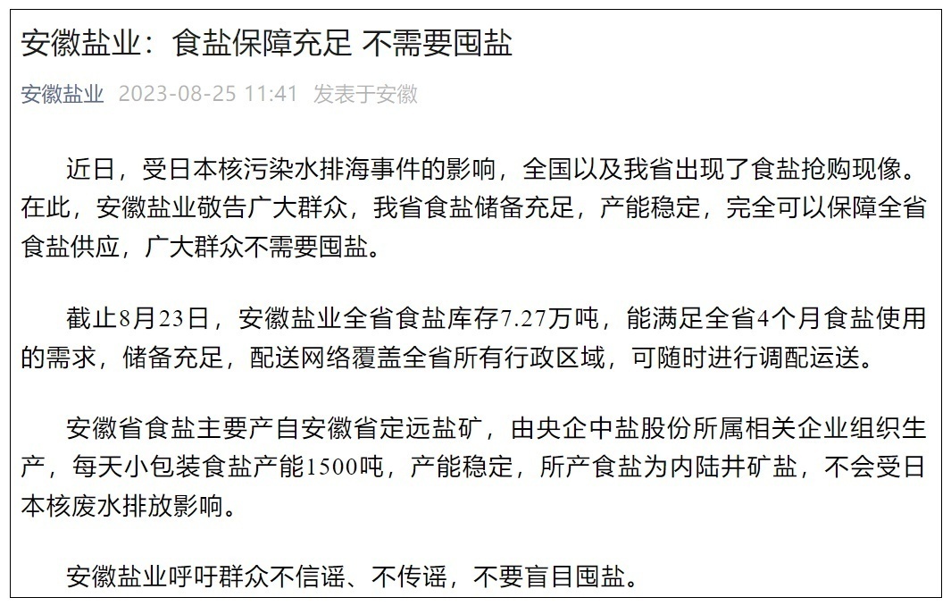 25日,安徽盐业集团发文表示,安徽省食盐储备充足,产能稳定,完全可以保障全省食盐供应,广大群众不需要囤盐。截至8月23日,安徽盐业全省食盐库存7.27万吨,能满足全省4个月食盐使用的需求,储备充足,配送网络覆盖全省所有行政区域,可随时进行调配运送。安徽省食盐主要产自安徽省定远盐矿,由央企中盐股份所属相关企业组织生产,每天小包装食盐产能1500吨,产能稳定,所产食盐为内陆井矿盐,不会受日本核废水排放影响。