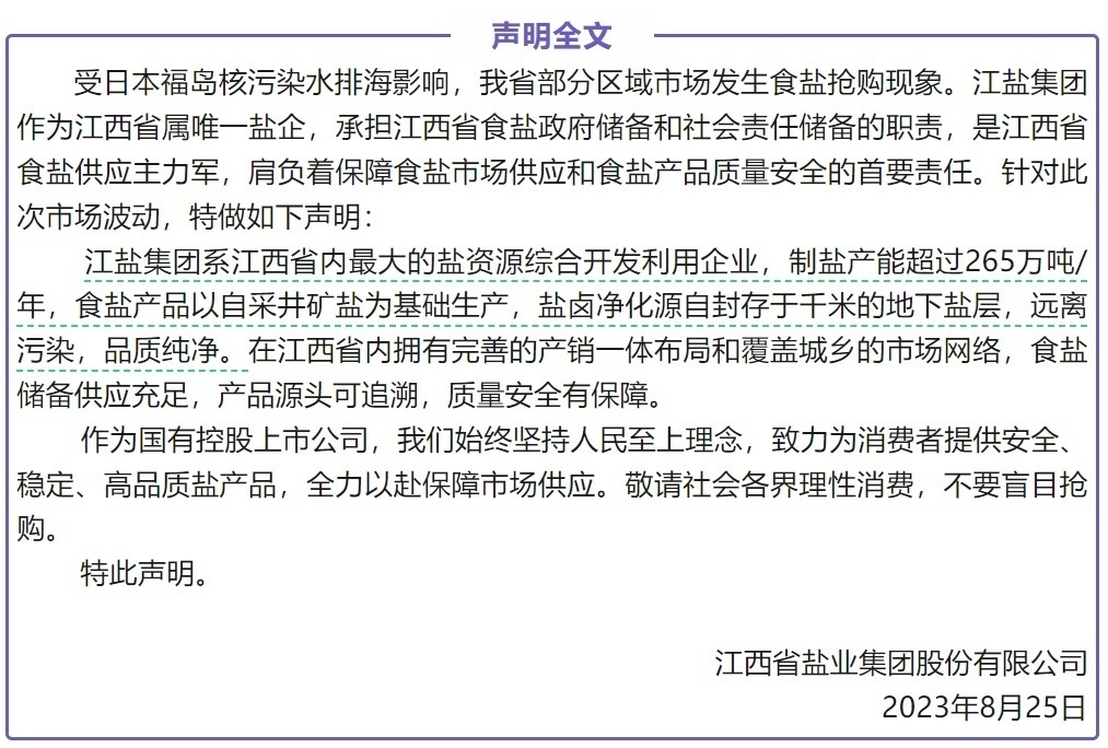 江盐集团25日发布声明称,江盐集团系江西省内最大的盐资源综合开发利用企业,制盐产能超过265万吨/年,食盐产品以自采井矿盐为基础生产,盐卤净化源自封存于千米的地下盐层,远离污染,品质纯净。在江西省内拥有完善的产销一体布局和覆盖城乡的市场网络,食盐储备供应充足,产品源头可追溯,质量安全有保障。公司将致力为消费者提供安全、稳定、高品质盐产品,全力以赴保障市场供应。敬请社会各界理性消费,不要盲目抢购。