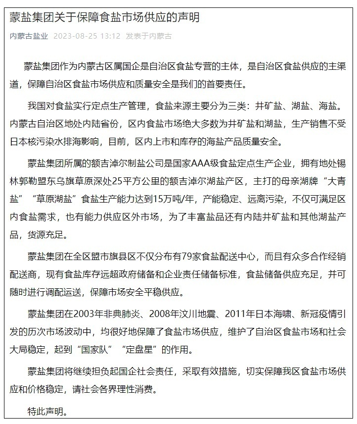 25日,蒙盐集团发布关于保障食盐市场供应的声明:内蒙古自治区地处内陆省份,区内食盐市场绝大多数为井矿盐和湖盐,生产销售不受日本核污染水排海影响,目前,区内上市和库存的海盐产品质量安全。蒙盐集团所属的额吉淖尔制盐公司是国家AAA级食盐定点生产企业,拥有地处锡林郭勒盟东乌旗草原深处25平方公里的额吉淖尔湖盐产区,主打的母亲湖牌“大青盐”“草原湖盐”食盐生产能力达到15万吨/年,产能稳定、远离污染,不仅可满足区内食盐需求,也有能力供应区外市场,为了丰富盐品还有内陆井矿盐和其他湖盐产品,货源充足。蒙盐集团在全区盟市旗县区不仅分布有79家食盐配送中心,而且有众多合作经销配送商,现有食盐库存远超政府储备和企业责任储备标准,食盐储备供应充足,并可随时进行调配运送,保障市场安全平稳供应。