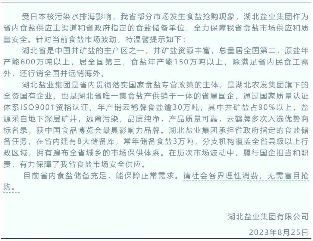 湖北盐业集团25日发布温馨提示:湖北省是中国井矿盐的主产区之一,井矿盐资源丰富,总量居全国第二,原盐年产能600万吨以上,居全国第三,食盐年产能150万吨以上,除满足省内民食工需外,还行销全国并远销海外。湖北盐业集团年产销云鹤牌食盐逾30万吨,其中井矿盐占90%以上,盐源采自地下深层矿井,远离污染,品质纯净,产品质量可靠。湖北盐业集团承担省政府指定的食盐储备任务,在省内建有8大储备库,常年储备食盐3万吨,分支机构覆盖全省县级以上行政区域,拥有遍布全省城乡的市场保供体系。目前湖北省内食盐储备充足,能保障正常需求。请社会各界理性消费,无需盲目抢购。