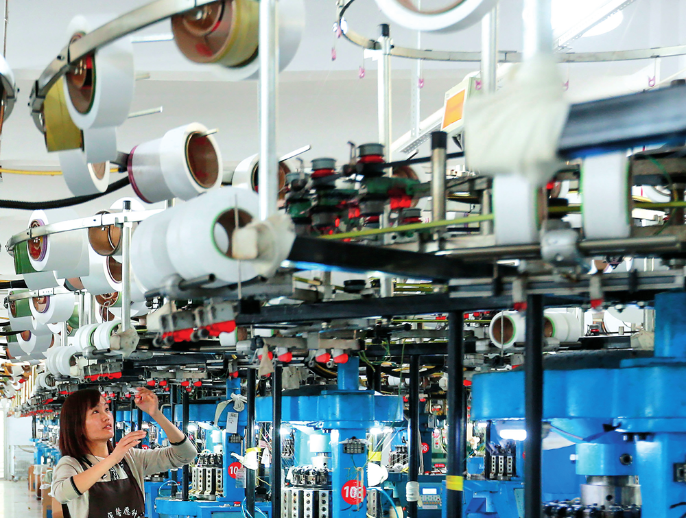 在安徽省淮北市杜集区石台镇农民工创业园,一家针织企业的工人在织袜车间作业(2023 年 3 月 28 日摄)万善朝摄 / 本刊