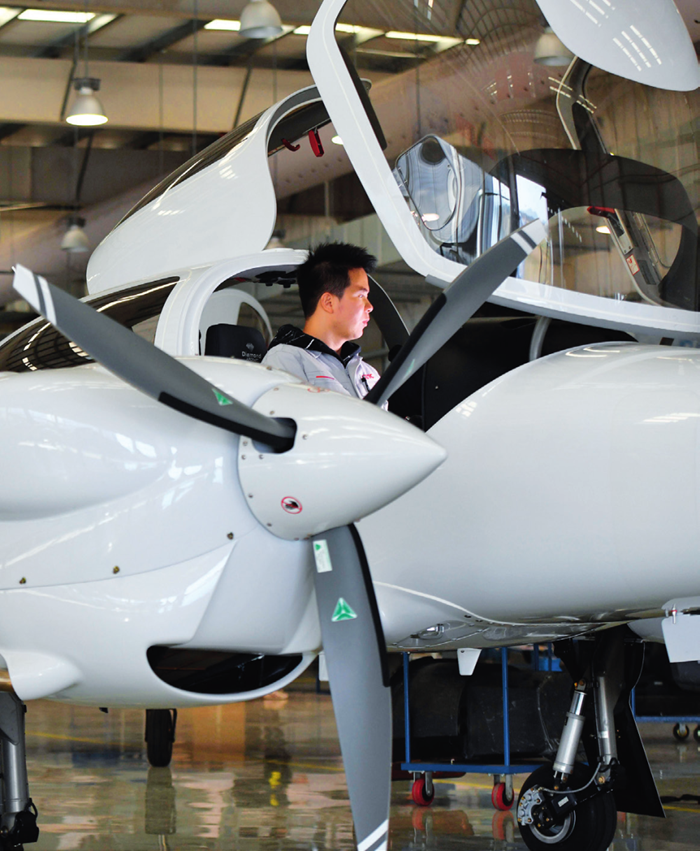 在位于安徽省芜湖市湾沚区的中电科芜湖钻石飞机制造有限公司内,技术人员进行飞机检测工作(2021 年 11 月 21 日摄)张端摄 / 本刊