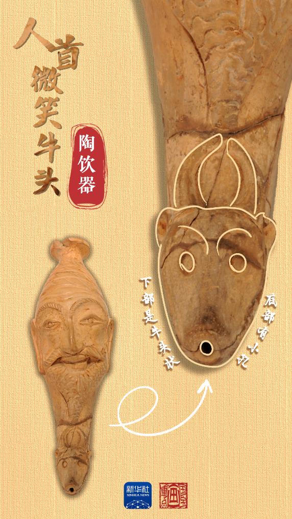 当中国丝绸的美誉经由古丝绸之路在西亚、欧洲等地传扬时,西方文明也穿过风沙与长歌,在中国留下了印记。人首微笑牛头陶饮器出土于和田地区约特干遗址,为唐代时期文物。饮器上部为人首形,下部是牛头状,底部带小圆孔,上下两部分内腔相通。人首上唇胡须外展卷翘,面带微笑。牛头微微上翘,牛角竖立拢圆。这种饮器造型源自“来通”,即末端为动物形或人首形的角杯,是小亚细亚和地中海地区常见的饮酒器具,丝绸之路沿线国家都有类似文物出土。