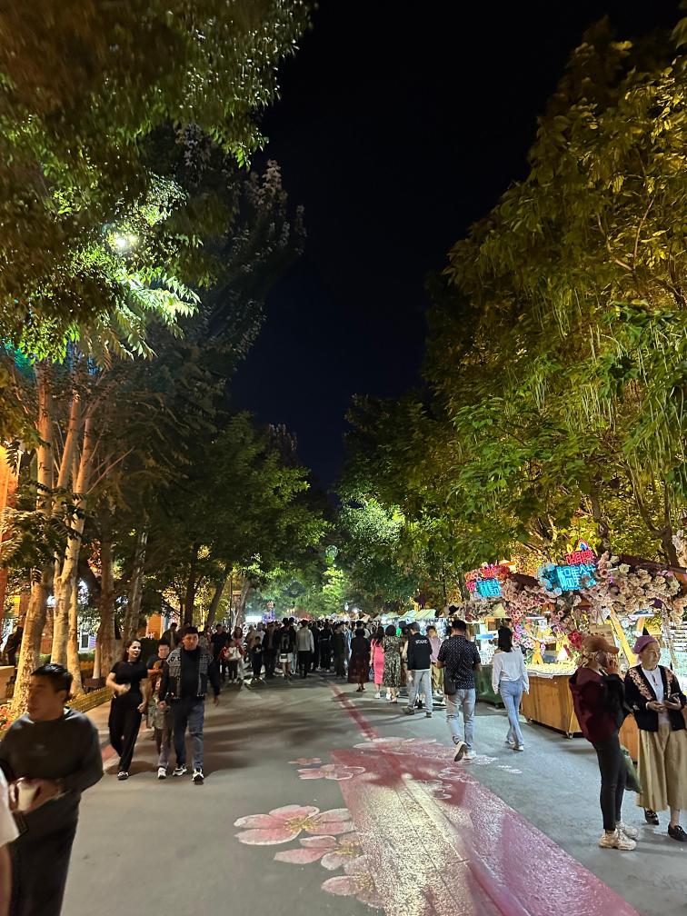 时近凌晨,伊宁市六星街区依旧人头攒动:广场上,人们聚在一起随着风格多变的音乐翩翩起舞;“网红”冰激凌店外,人们为品尝这一口香甜排起长队;支巷里,沿街店家将桌椅挪至户外,供客人沿街而坐安享夜色。
