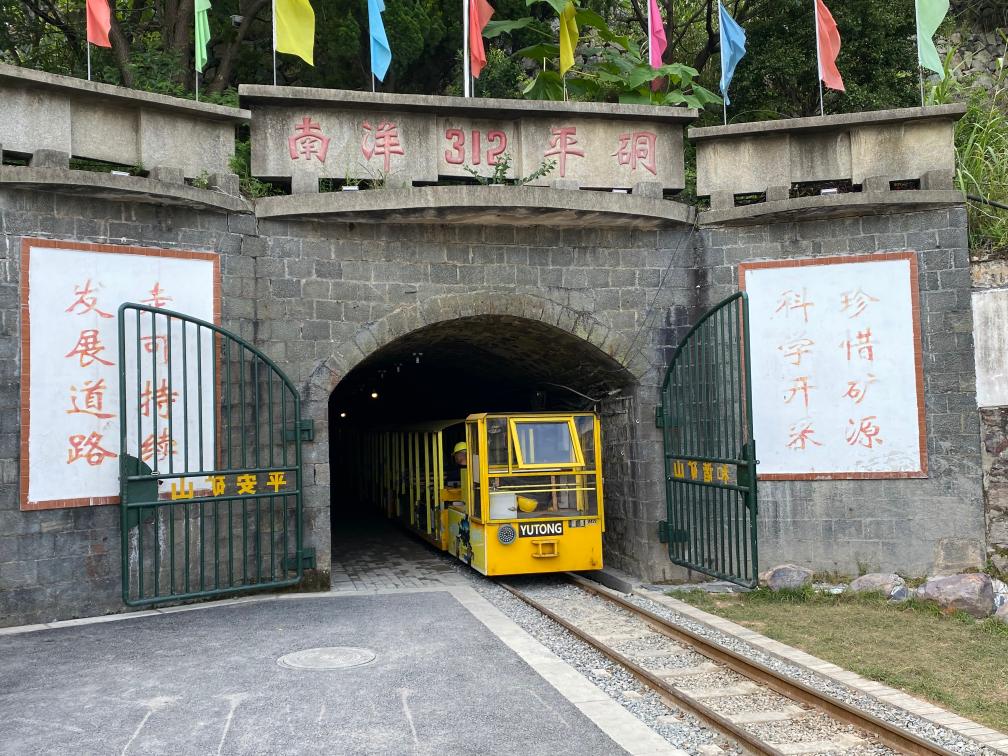 南洋312平硐位于鸡笼山北坡312米海拔处,这里曾是温州矾矿主采矿区。“数百年的开采使鸡笼山山腹内形成10层矿硐,南洋312平硐处于第4层。”张传军介绍,20世纪50年代后期,这里铺设了铁轨,采用手工、电耙混合装车,将明矾矿石运输到炼矾厂储矿场,结束了人力挑运矿石的历史。