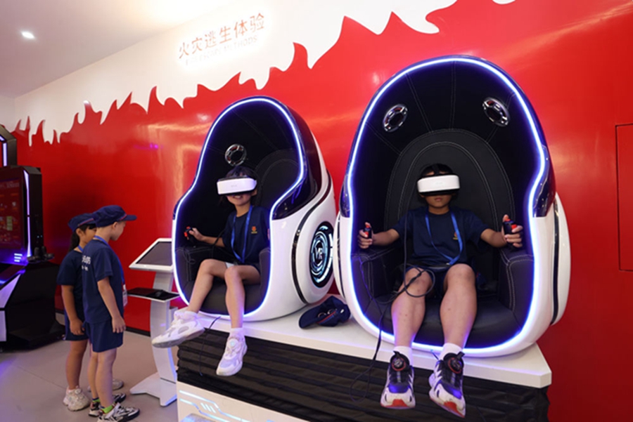 8月2日,在福建省厦门市消防科技教育馆,小学生通过消防VR设备体验火灾逃生。 新华社发(曾德猛 摄)