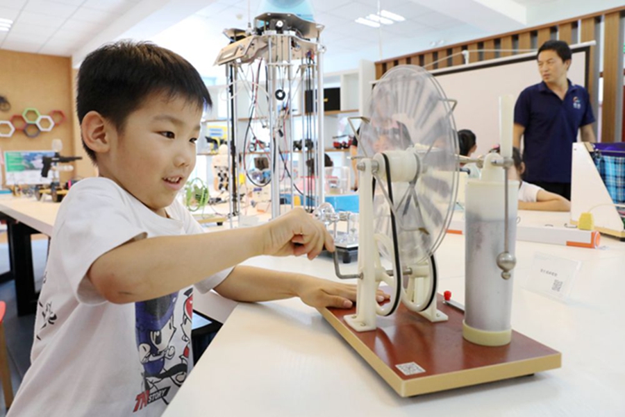 8月4日,在山东省青岛西海岸新区黄岛街道前湾社区科普馆,青少年在体验静电感应起电机。 新华社发 (王培珂 摄)