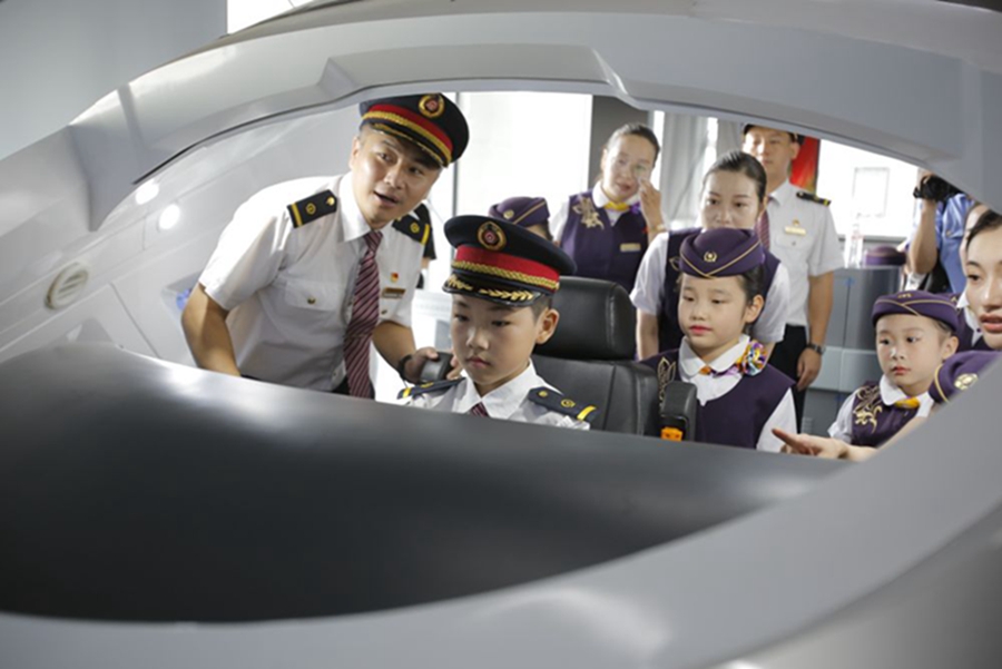 8月8日,小列车长们在南京东机辆段动车运用车间参观模拟驾驶台,沉浸式体验动车驾驶仿真器。 新华社记者 柳文惠 摄