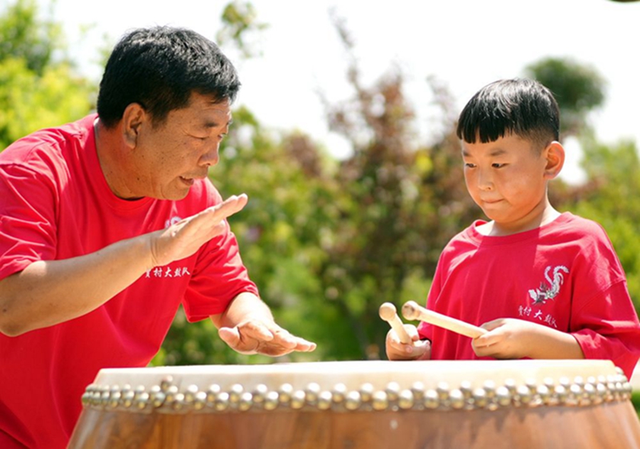 8月14日,在河北省沧州市沧县旧州镇贾村,大鼓艺人指导学生练习贾村大鼓。 新华社记者 骆学峰 摄