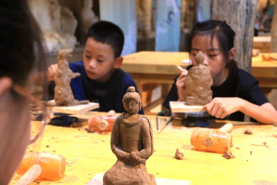 7月26日,在甘肃省敦煌市莫高里工匠村研学课堂,孩子们学习制作木胎泥塑。 新华社发(张晓亮摄)