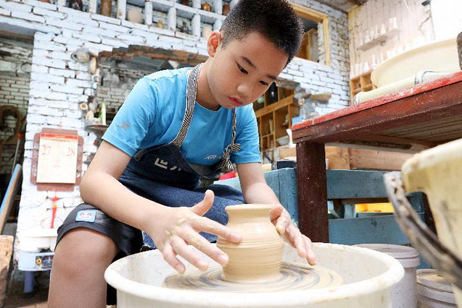 8月13日,小学生在福建省福州市长乐区吴村村陶源里文创街区学习制作陶艺作品。 新华社发(王旺旺摄)