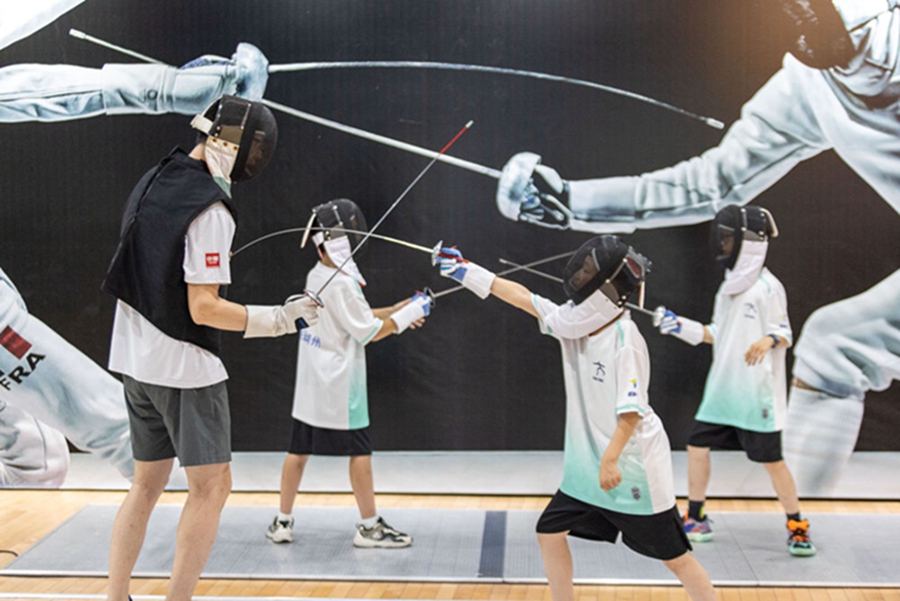 7月30日,在浙江省湖州奥体中心超越击剑馆,小朋友在练习击剑攻防技巧。新华社发(伊凡摄)