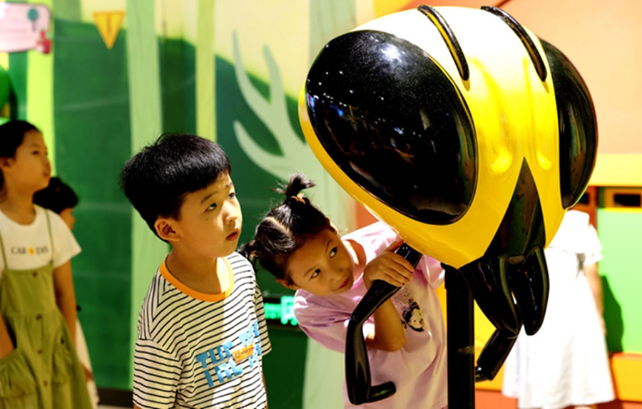 7月30日,在山东省枣庄市科技馆,小朋友在了解“小黄蜂”飞行的奥秘。新华社发(孙中喆 摄)