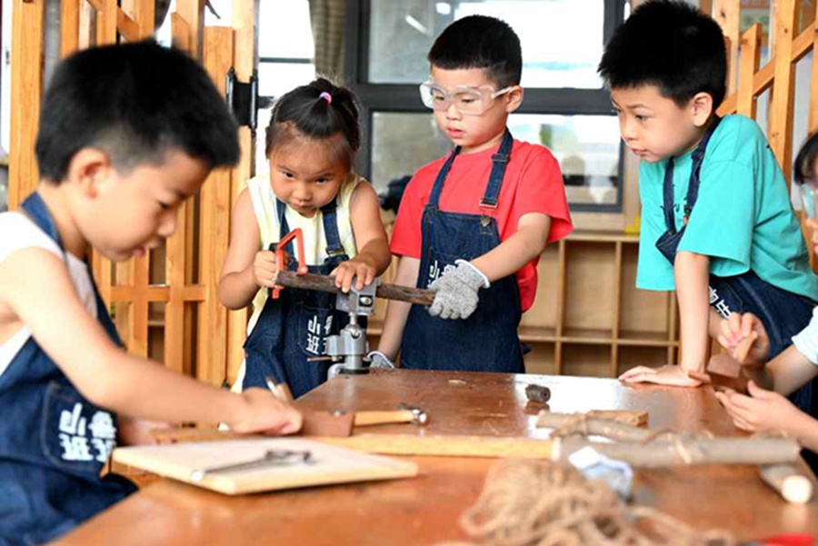 8月2日,小朋友在河北省石家庄市新华区星禾幼儿园体验木工制作。 新华社发(陈其保摄)