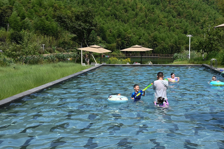 8月6日,小朋友在浙江省安吉县山川乡大里村一家民宿酒店的泳池戏水。新华社记者 黄宗治 摄