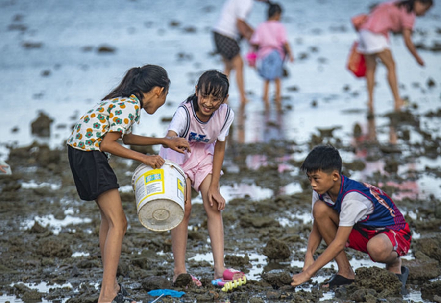8月16日,人们在海南省琼海市潭门港海域赶海拾贝。新华社发(蒙钟德摄)