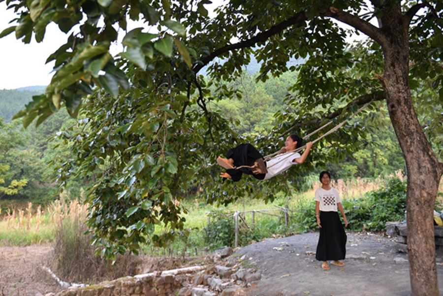 8月19日,孩子们在晚餐后荡秋千玩耍。 新华社记者 陈振海 摄