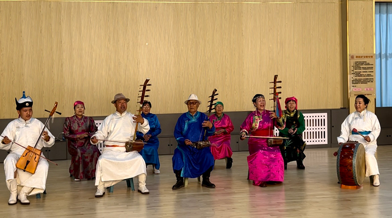 图为格斯尔传习所内说唱艺人深情地弹奏吟唱。新华网 武文卓 摄