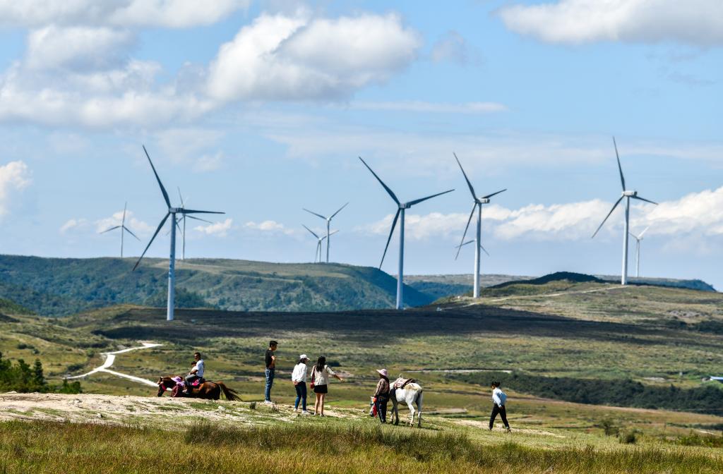 游客在龙里大草原的风电场观光(2021年9月21日摄)。