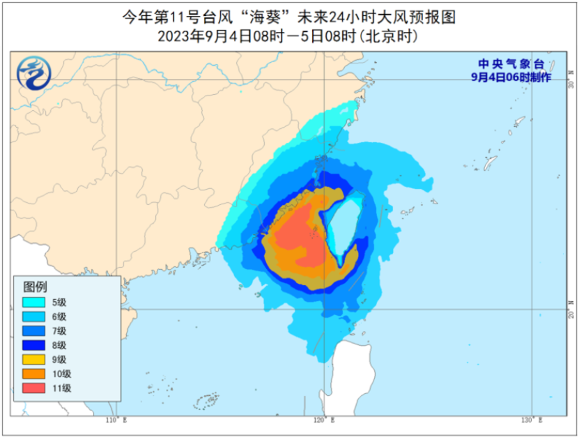 受台风“海葵“影响,9月4日08时至5日08时,巴士海峡、台湾海峡、台湾以东洋面、东海南部及钓鱼岛附近海域、南海东北部以及浙江南部沿海、福建沿海、广东东部沿海、台湾岛及沿海将有6-8级、阵风9-10级大风,部分海域或地区的风力有9-10级,阵风11-12级,“海葵”中心经过的附近海面或地区的风力有11级,阵风12-13级(见图2)。