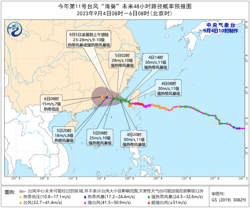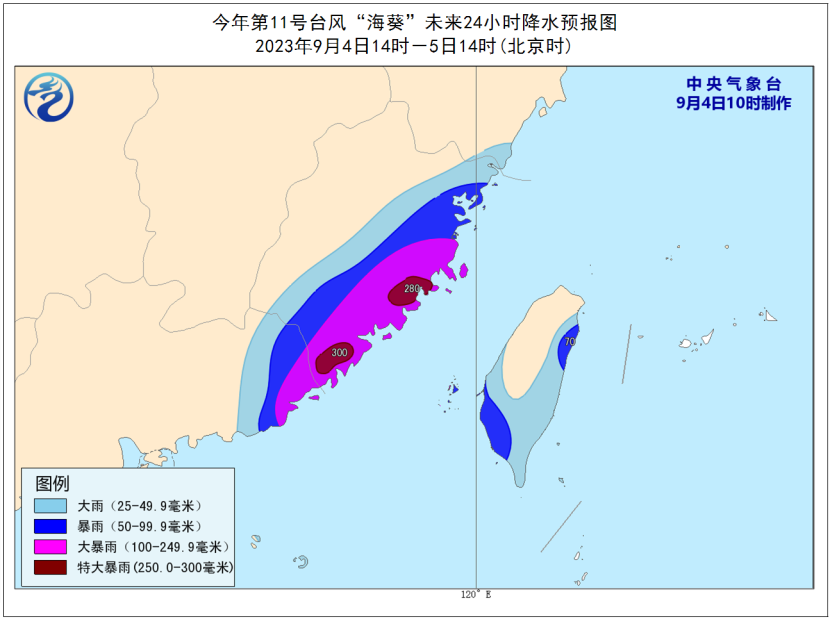 降水预报:9月4日14时至5日14时,福建东部、广东东部、浙江南部、台湾岛南部和东部等地部分地区有大到暴雨,其中,福建东南部、广东东南部等地部分地区有大暴雨,局地特大暴雨(250-300毫米);上述部分地区最大小时降雨量30-60毫米,局地可超过80毫米,局地有雷暴大风等强对流天气。