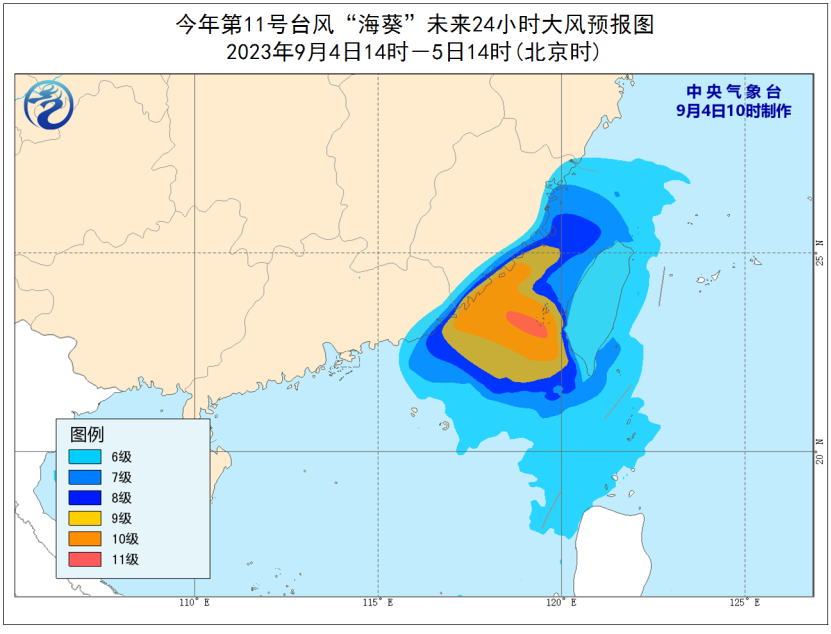 大风预报:9月4日14时至5日14时,巴士海峡、台湾海峡、台湾以东洋面、东海南部及钓鱼岛附近海域、南海东北部以及福建沿海、广东东部沿海、台湾岛及沿海将有6-8级、阵风9-10级大风,部分海域或地区的风力有9-10级,阵风11-12级,“海葵”中心经过的附近海面或地区的风力有11级,阵风12-13级。
