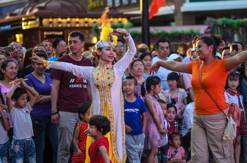 在乌鲁木齐大巴扎景区,游客和演员一起跳舞(2019年7月24日摄)。新华社记者 王菲 摄