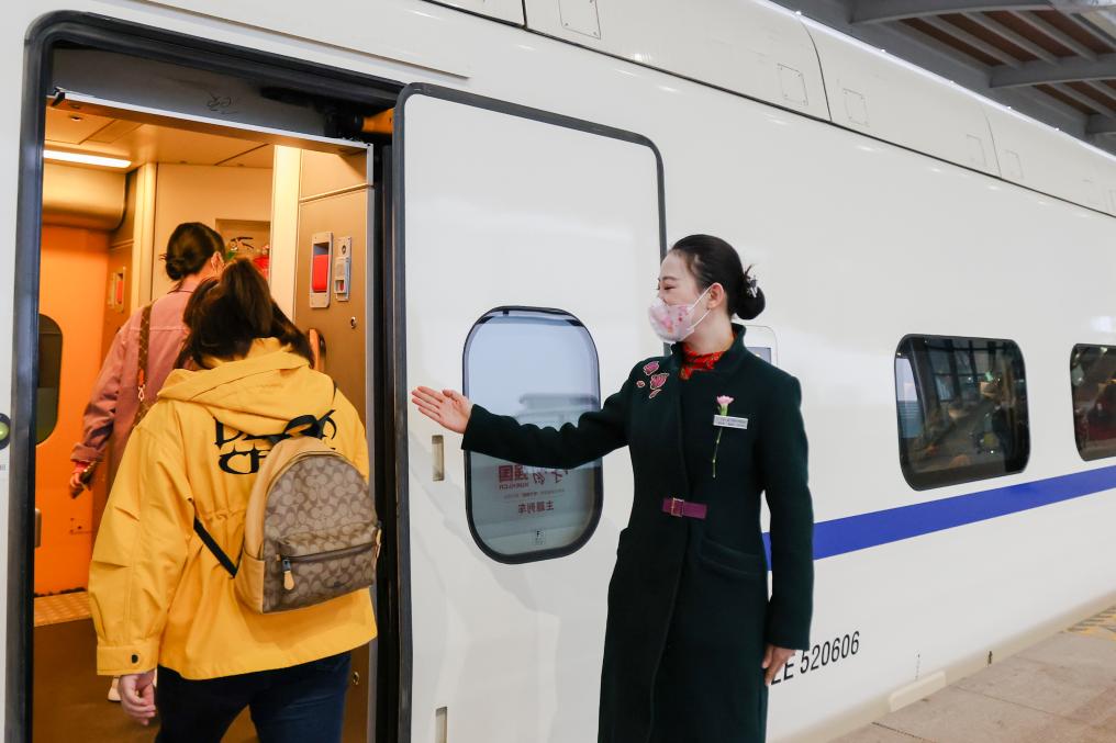 2023年3月17日,列车员李泓祁在乌鲁木齐站引导乘客乘车。新华社记者 郝昭 摄