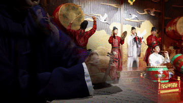 2006年4月,东仓鼓乐社入驻大唐芙蓉园紫云楼,开始固定演出。2021年大年初一,一部融合了西安鼓乐、大唐乐舞、戏剧情节以及现代声光电技术等元素的创新舞台剧《鼓》和观众初次见面。炫目的舞台效果、华美的妆造服饰令人拍手叫绝,流连忘返。
