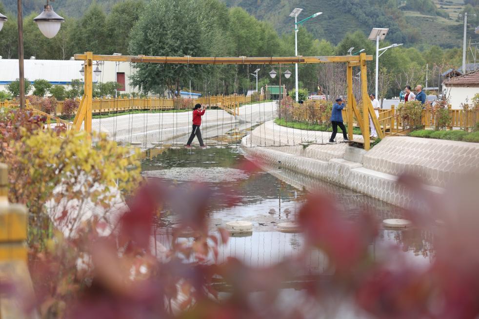 8月31日,在西宁市大通回族土族自治县东峡镇田家沟村,游客正在吊桥上行走。新华社记者李宁 摄