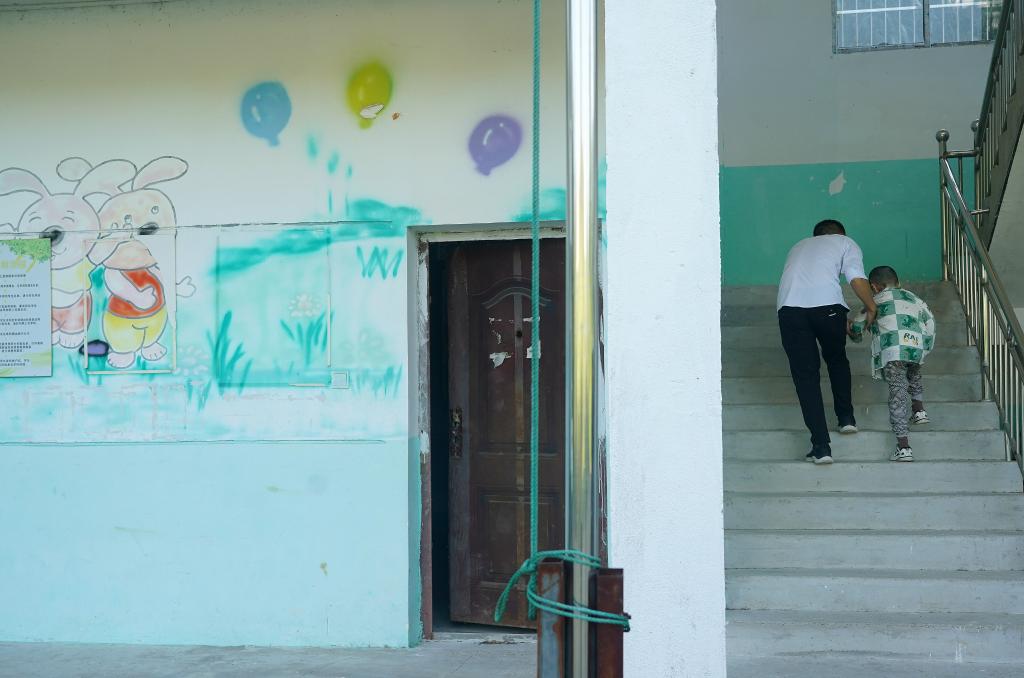 9月4日,在朱家教学点,李新江(左)牵着小泽(右)去二楼上课。新华社记者 万象 摄