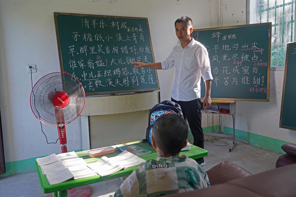 这是江西省高安市华林山镇中心小学朱家教学点的五年级语文课堂。李新江是这里唯一的老师,而坐在台下认真听讲的小泽是唯一的学生。