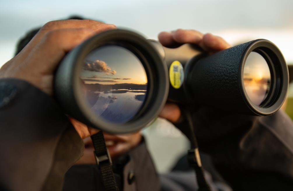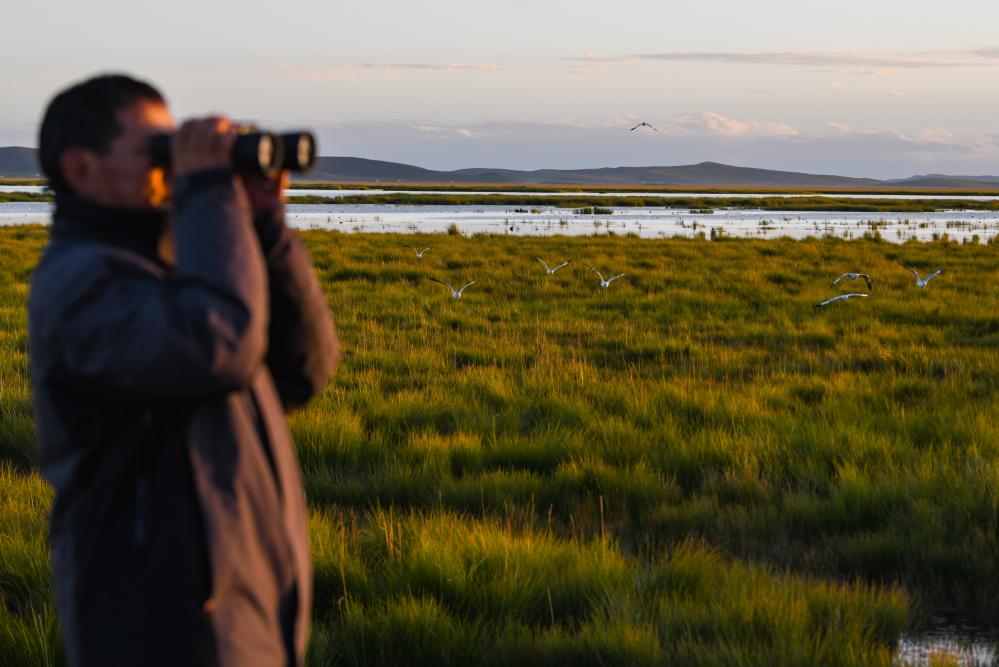 如科在花湖湿地用望远镜观察周边环境。新华社记者 王曦 摄