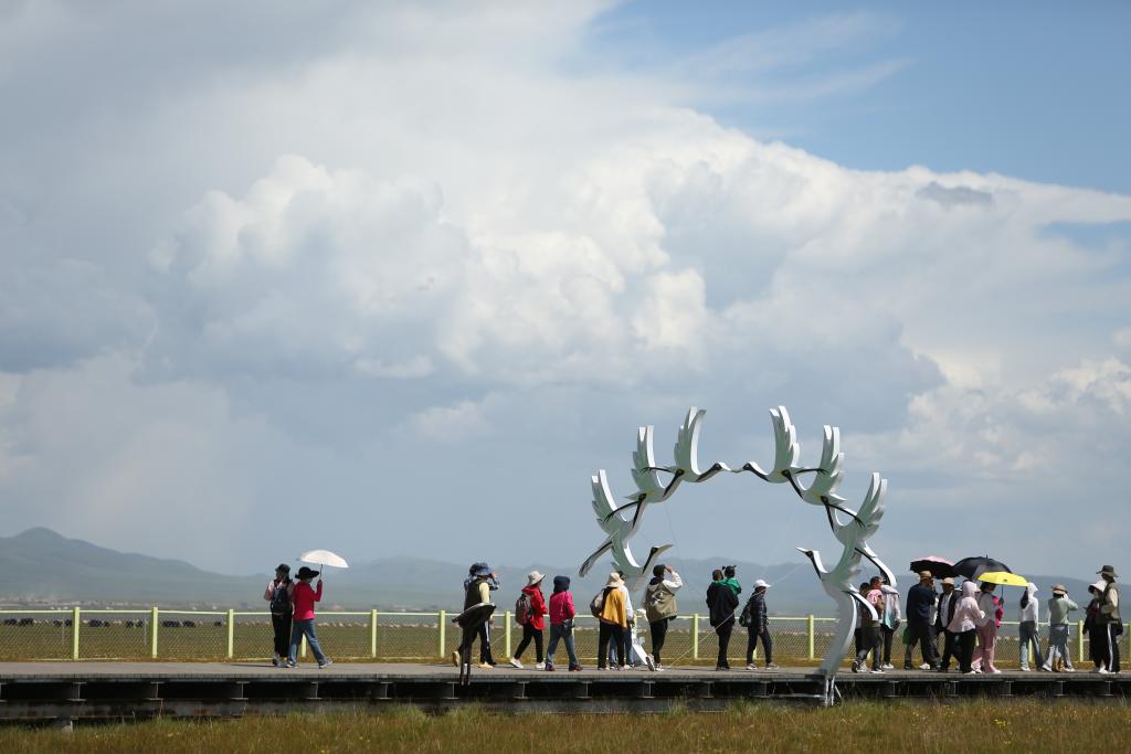 游客在四川省阿坝藏族羌族自治州若尔盖县花湖湿地观光。新华社记者 王乙杰 摄