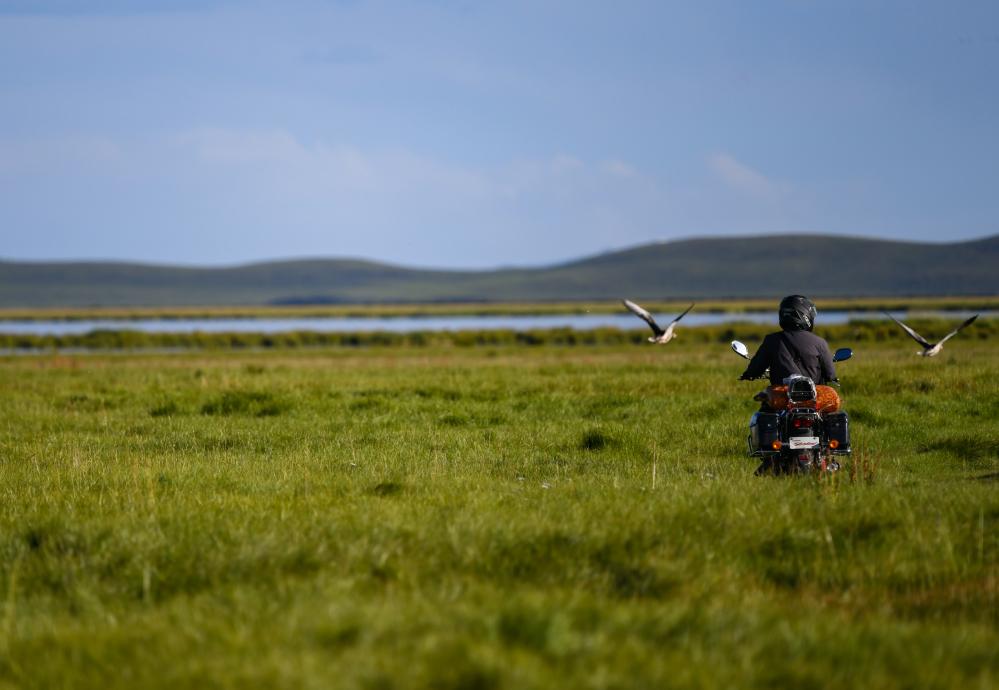 如科骑着摩托车在花湖湿地周围巡查。新华社记者 王曦 摄