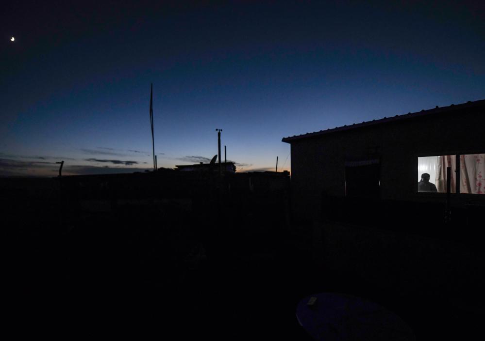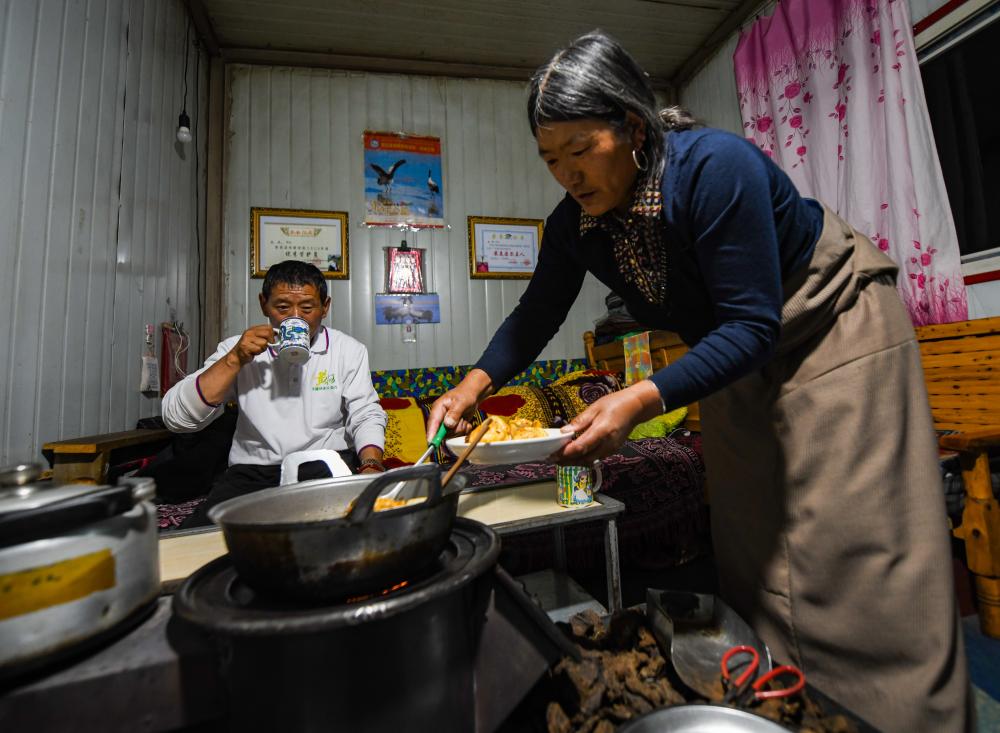 如科和妻子纳么姐在花湖湿地居住的小屋内做晚饭。新华社记者 王曦 摄