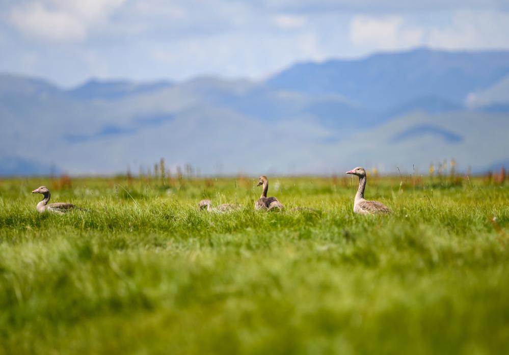 这是在四川省阿坝藏族羌族自治州若尔盖县花湖湿地拍摄的灰雁。新华社记者 王曦 摄