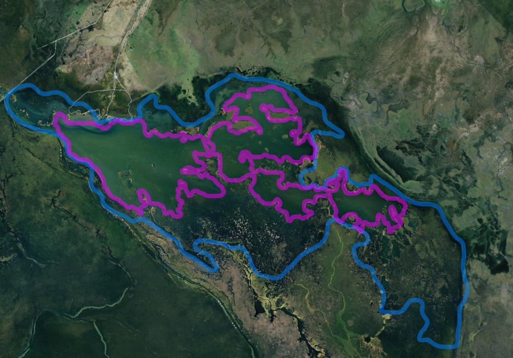 这是花湖湿地卫星图片。红线范围是2009年7月花湖面积,蓝线范围是2021年7月花湖面积。(四川若尔盖湿地国家级自然保护区管理局供图)