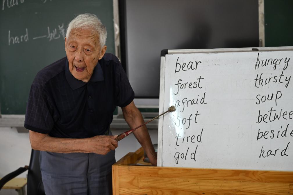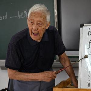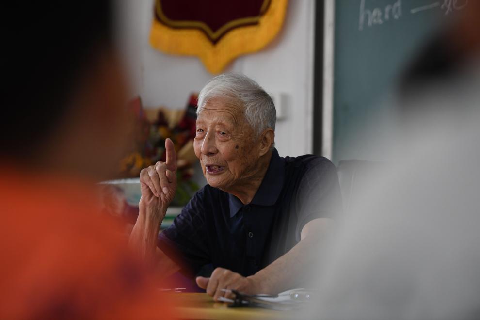 虽然年过九旬,满头银发的叶连平讲起英语课来发音标准、声音洪亮,孩子们听得十分专注。