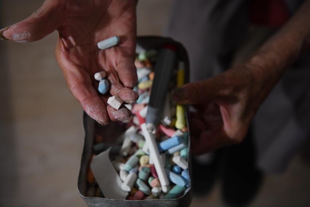 9月9日,叶连平展示他仍在使用的粉笔头。新华社记者 张端 摄