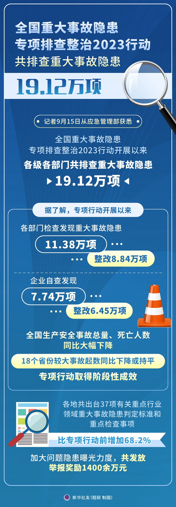 新华社北京9月15日电(记者周圆)记者15日从应急管理部获悉,全国重大事故隐患专项排查整治2023行动开展以来,各级各部门共排查重大事故隐患19.12万项。