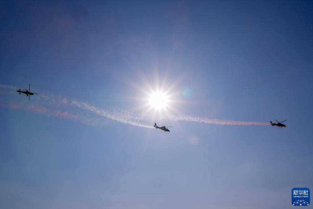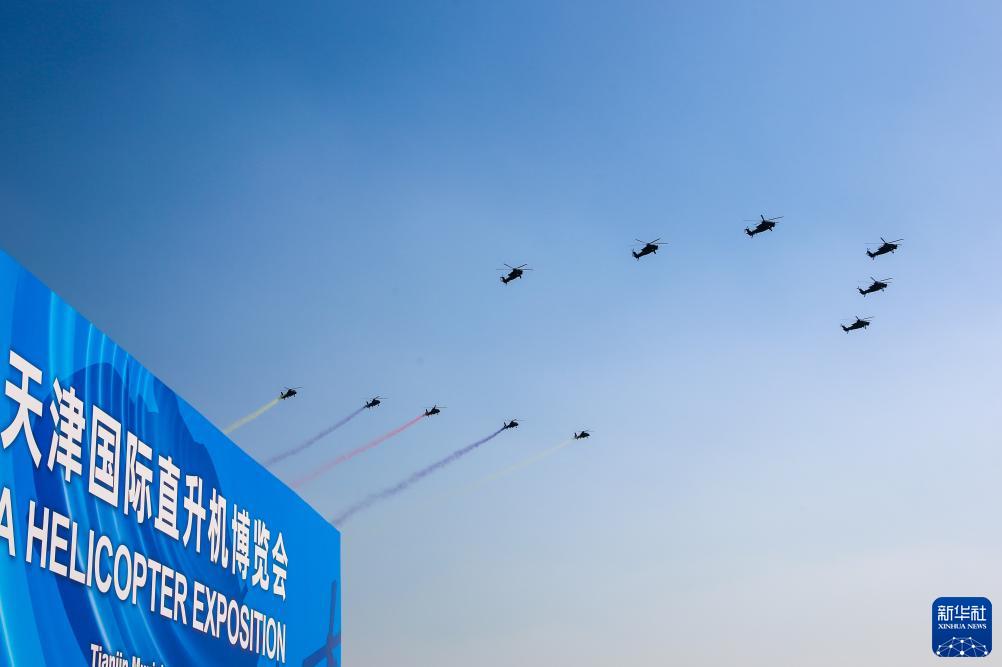 渤海湾畔,海风徐徐。陆军“风雷”飞行表演队10余架战鹰列阵长空,直-10、直-19、直-20三型直升机为第六届中国天津国际直升机博览会观众献上一场视觉盛宴。