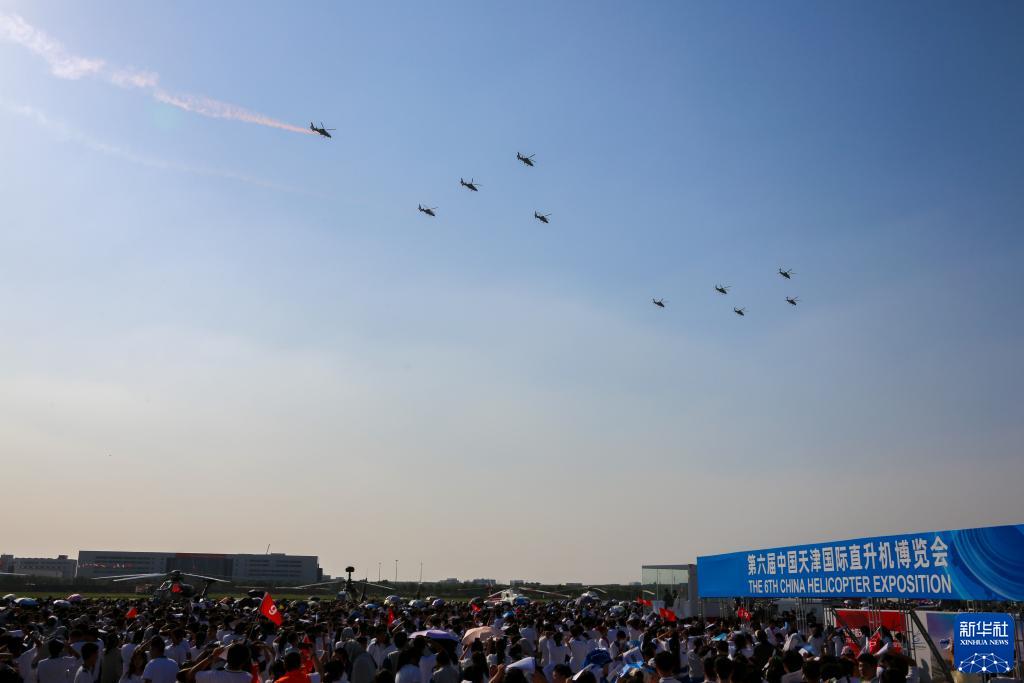 9月15日,在第六届中国天津国际直升机博览会上,陆军“风雷”飞行表演队直-19武装直升机进行飞行表演。新华社发(栾铖 摄)