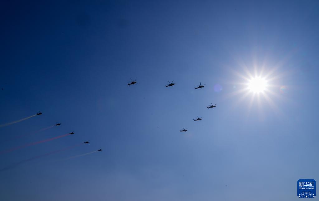 10架直升机组成“二十”字样,从场外疾驰而来,向远空振翅而去,为这场盛宴画上圆满句号。
