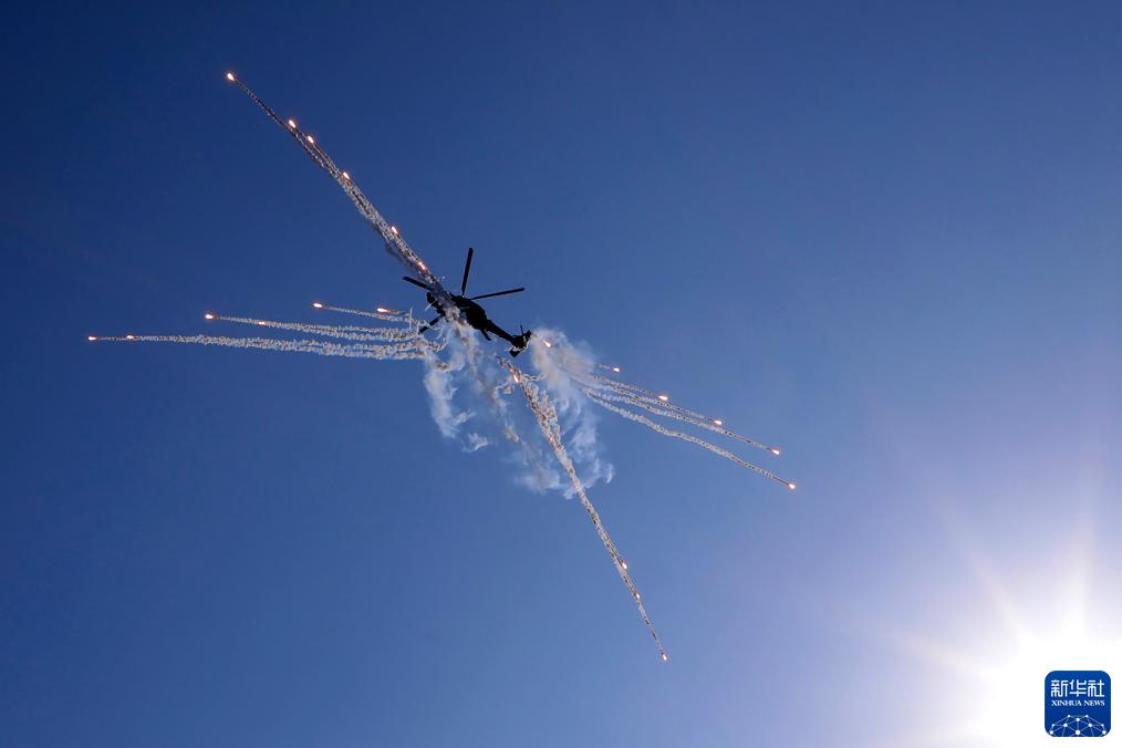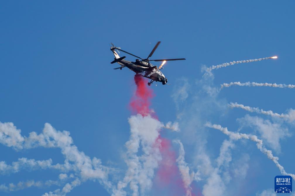 9月15日,在第六届中国天津国际直升机博览会上,陆军“风雷”飞行表演队直-10武装直升机发射干扰弹。新华社记者 张永进 摄