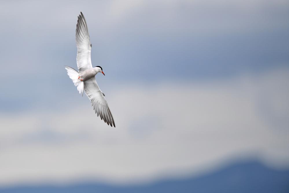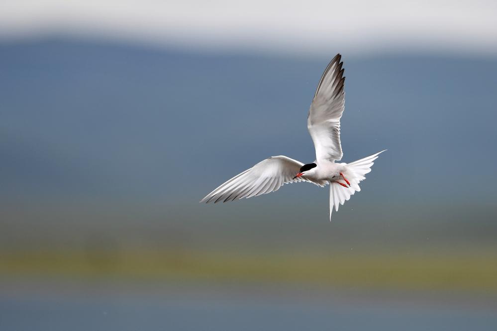 一只燕鸥在甘肃尕海则岔国家级自然保护区的尕海湿地上飞翔。 新华社记者 陈斌 摄
