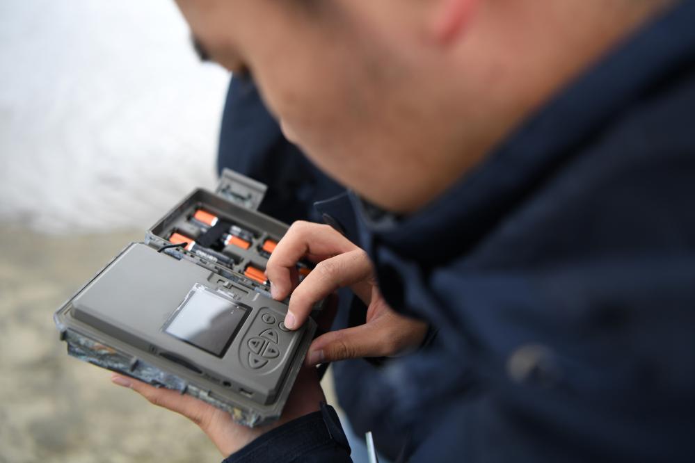 甘肃黄河首曲国家级自然保护区管护中心曼日玛保护站的工作人员在保护区内检查红外相机的工作情况。 新华社记者 方欣 摄