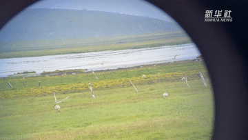 甘肃尕海则岔国家级自然保护区管护中心尕海保护站站长香毛吉(左一)和同事在保护区内用望远镜观测野生动物。 新华社记者 陈斌 摄