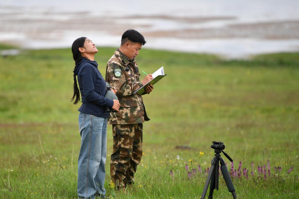 甘肃尕海则岔国家级自然保护区管护中心尕海保护站站长香毛吉(左)和同事在巡护过程中做记录。 新华社记者 方欣 摄