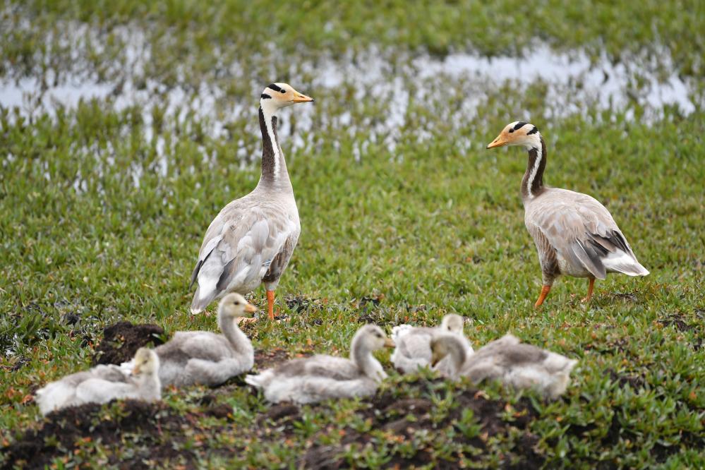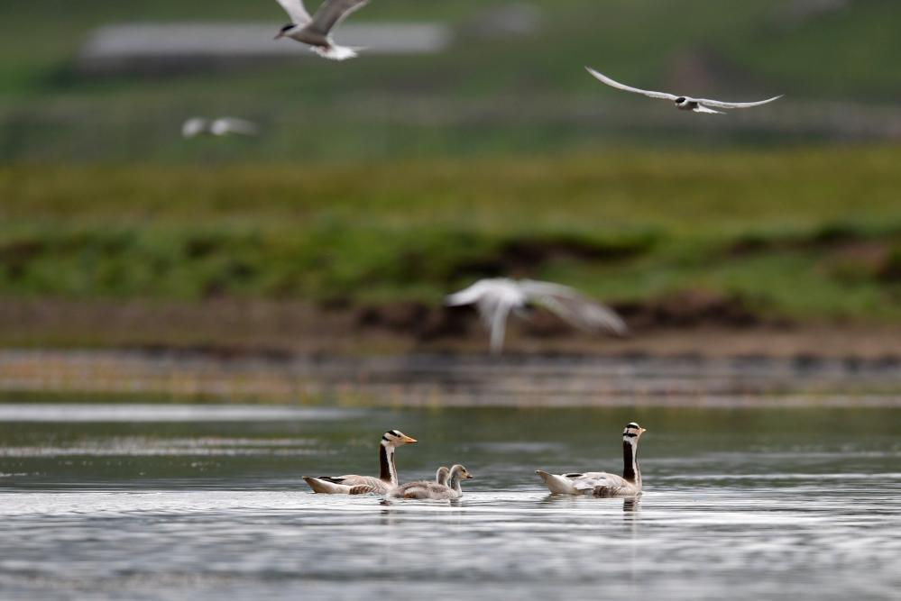 这是在甘肃尕海则岔国家级自然保护区的尕海湿地上拍摄的斑头雁。 新华社记者 陈斌 摄